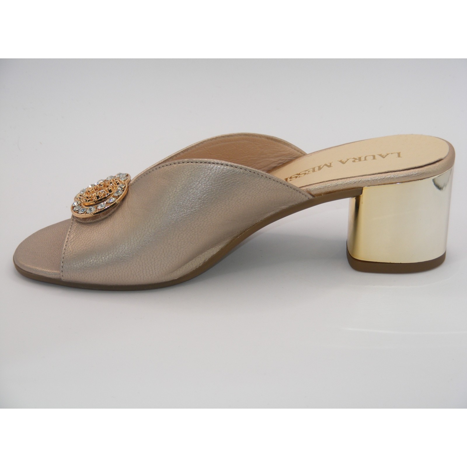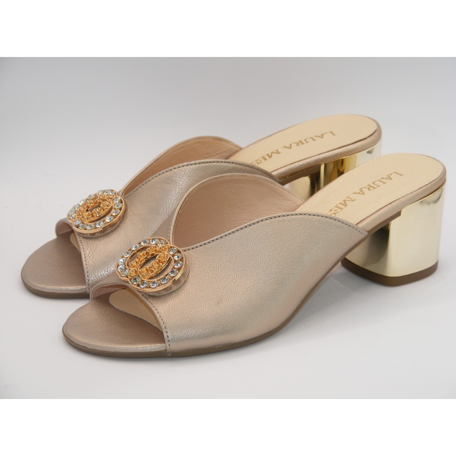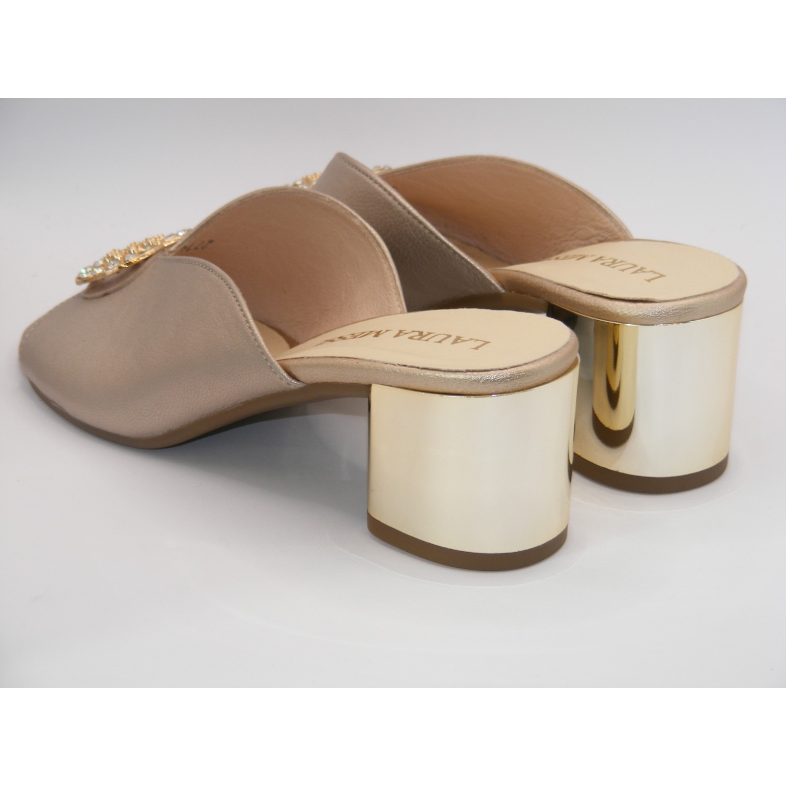 Złote klapki na klocku z ozdobą Laura Messi2714