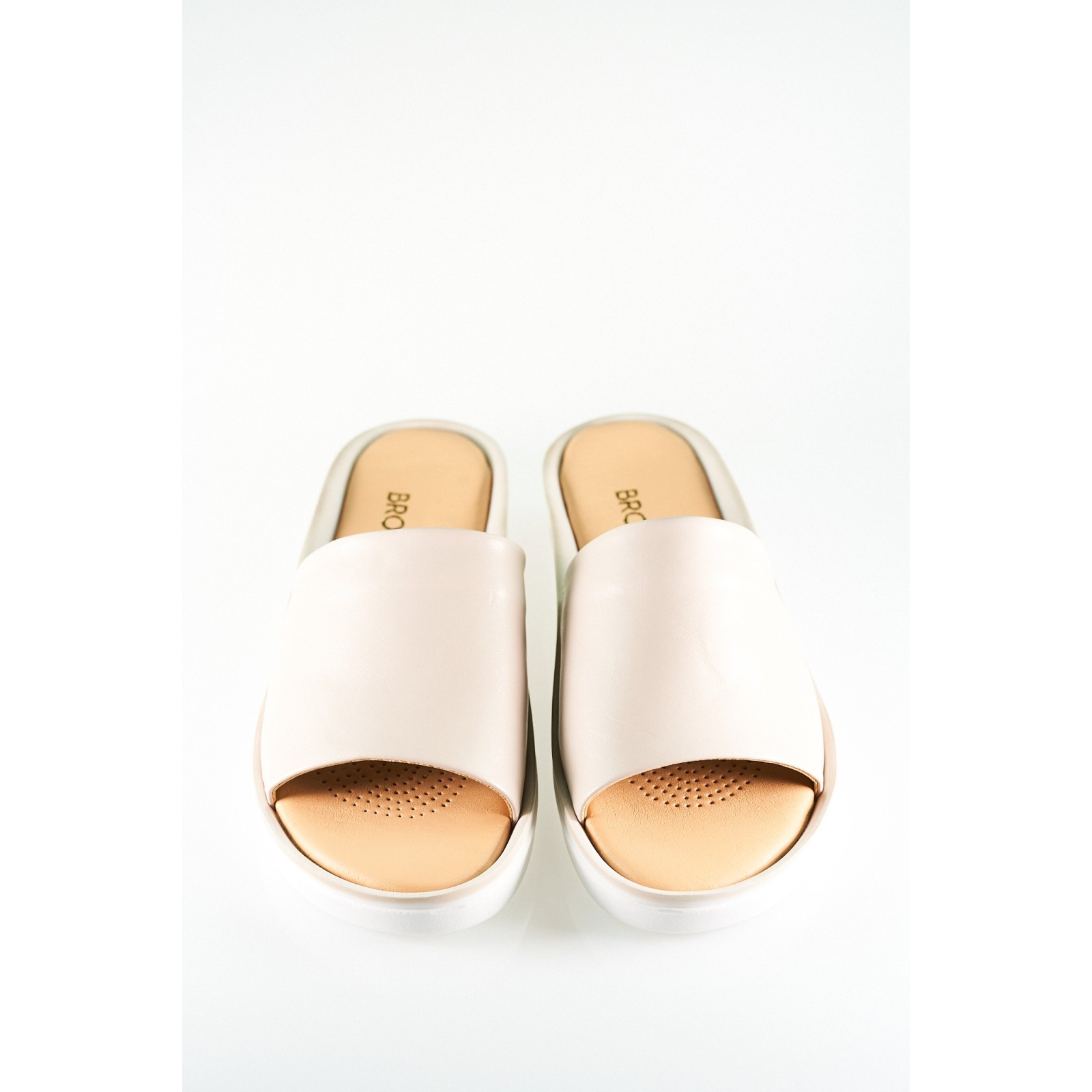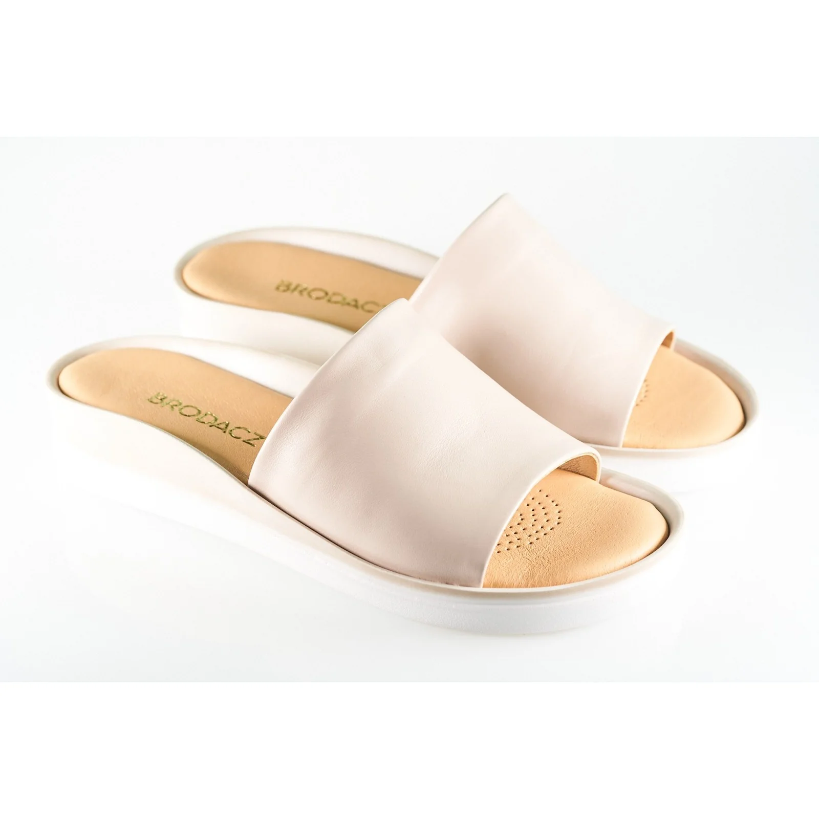 Skórzane klapki Brodacz na niskiej koturnie w eleganckim kolorze capuccino to doskonały wybór dla kobiet ceniących sobie wygodę, modny wygląd i wysoką jakość wykonania. Te lekkie, stabilne klapki świetnie sprawdzą się na spacerach, plaży czy codziennych wyjściach, dodając Twojej stylizacji subtelnego uroku.