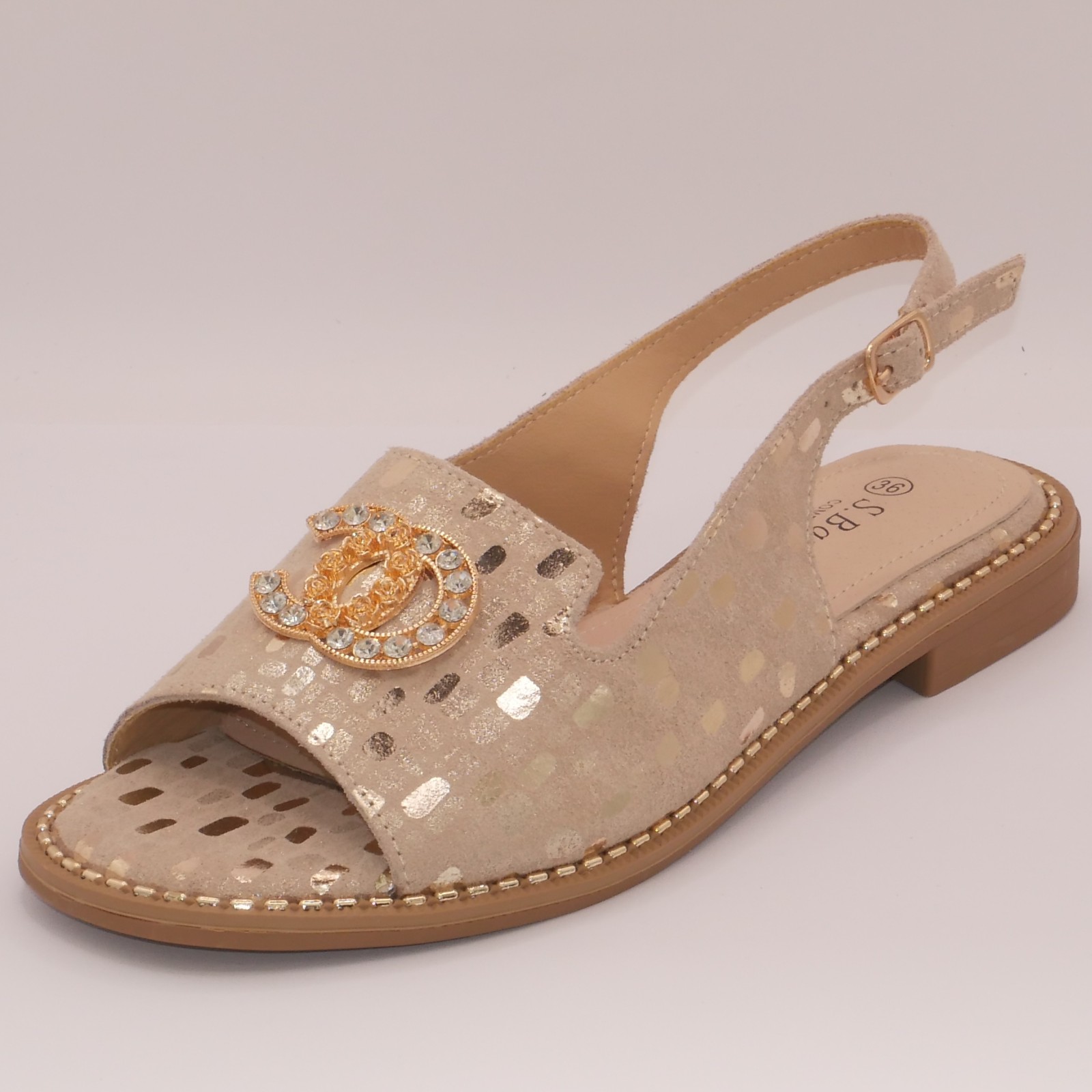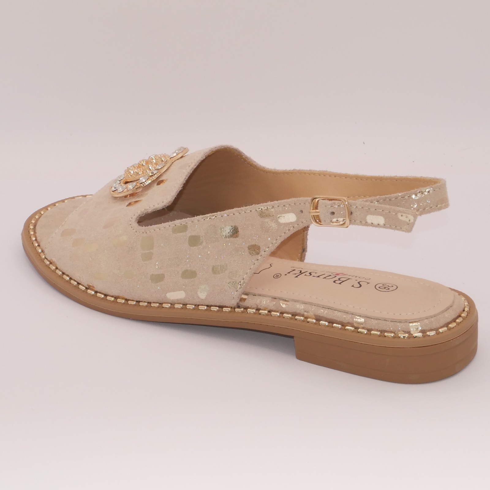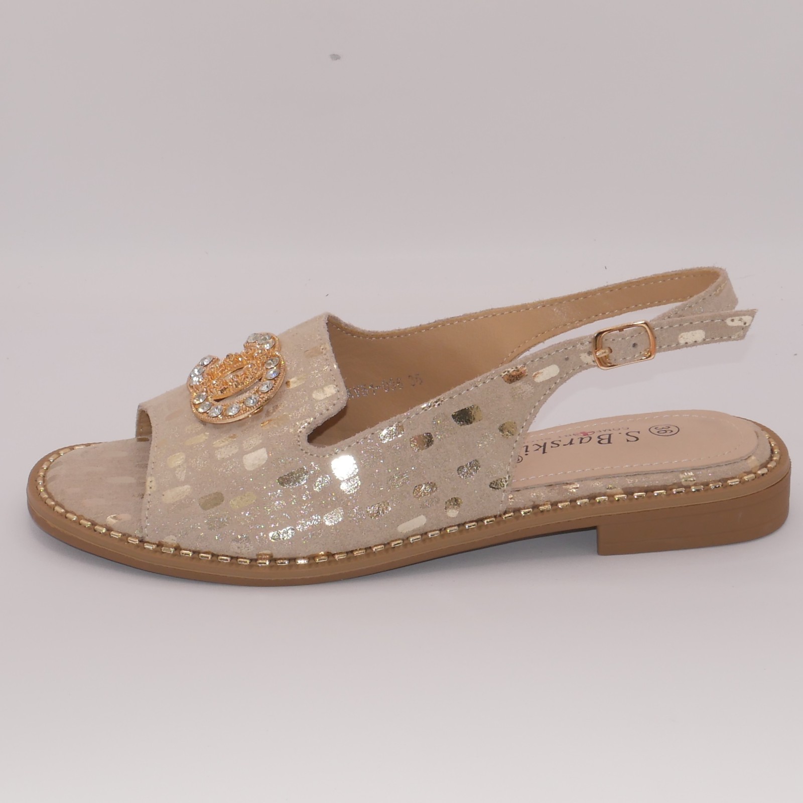 Stylowe sandałki na lato od marki S-BARSKI. Wykonane z naturalnej skóry, w modnym złotym kolorze z piękną ozdobą na przodzie. Idealne na wesele, komunię, randkę lub co dzień.