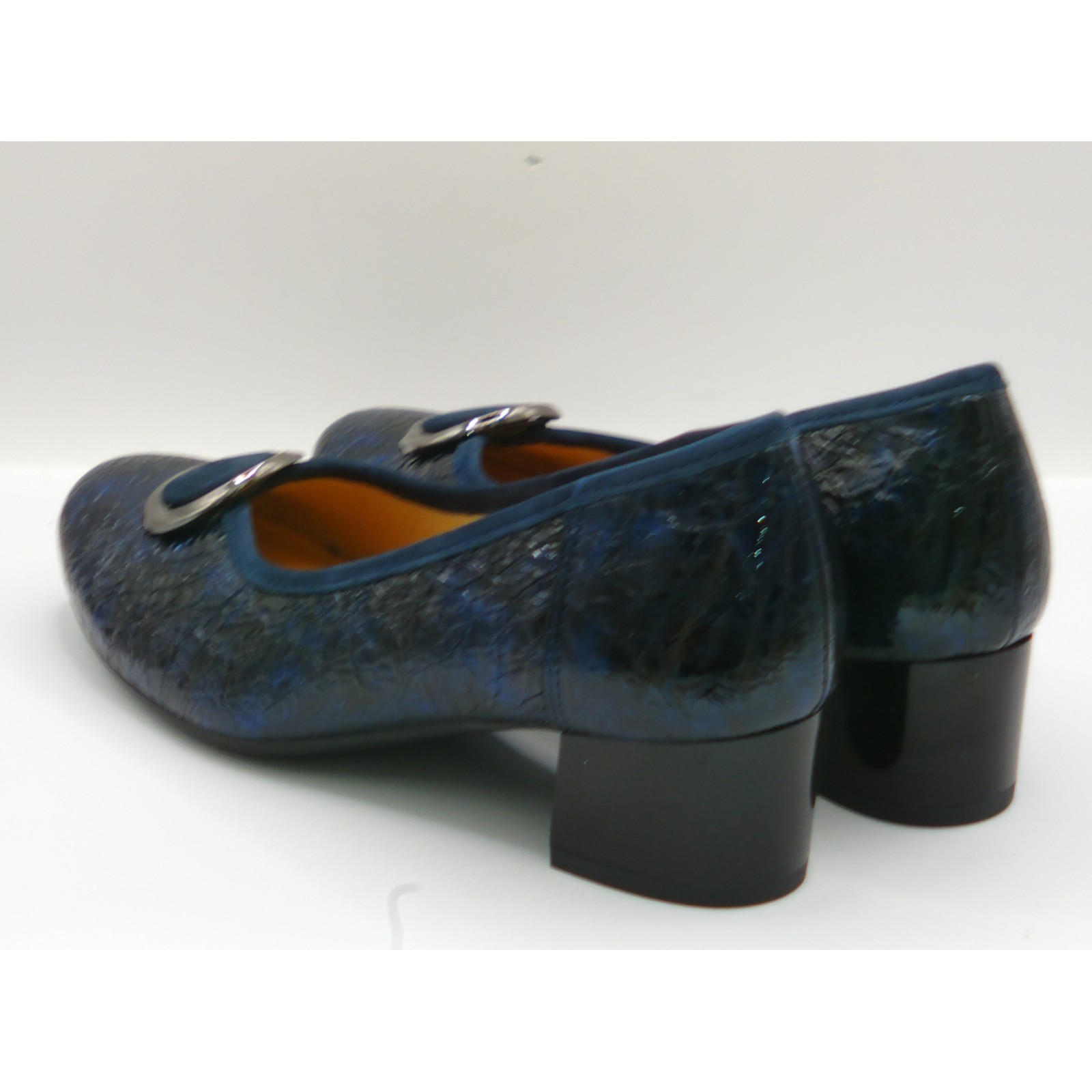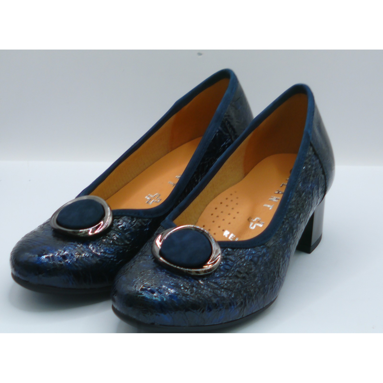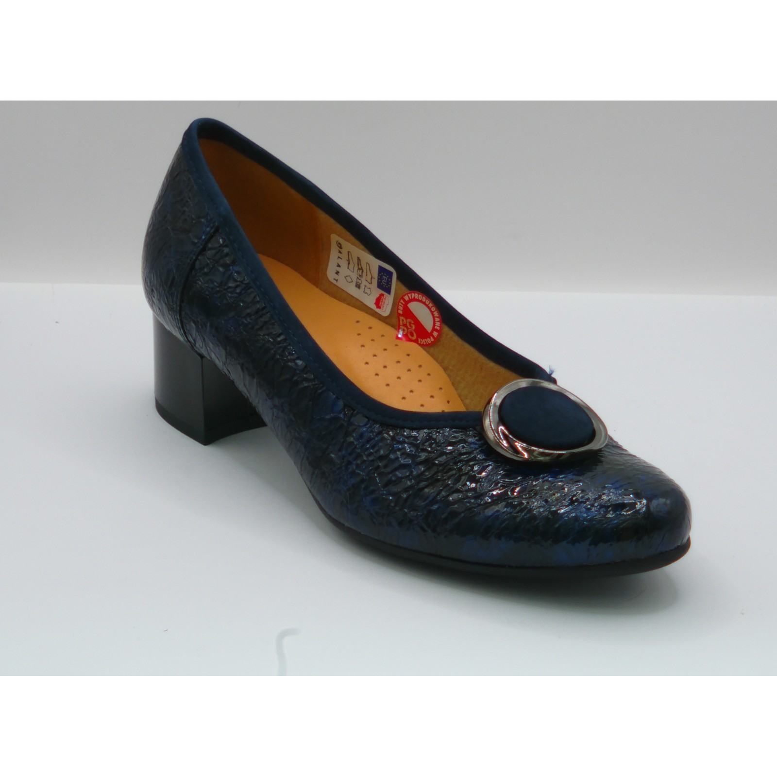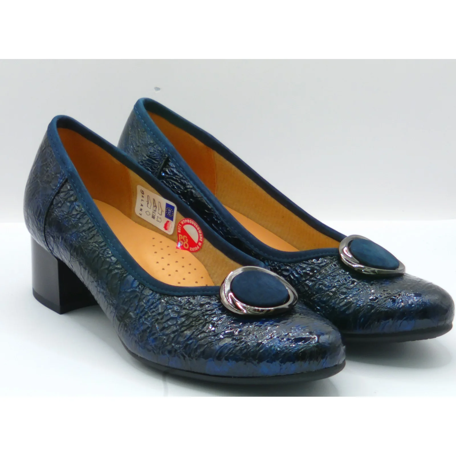 Wykonane z najwyższej jakości skóry naturalnej lakierowanej w głębokim, granatowym odcieniu — delikatnie tłoczony materiał nadaje im elegancki i oryginalny wygląd. Czółenka posiadają stylowy obcas typu słupek o wysokości 6,5 cm, co zapewnia stabilność i kobiecą sylwetkę.