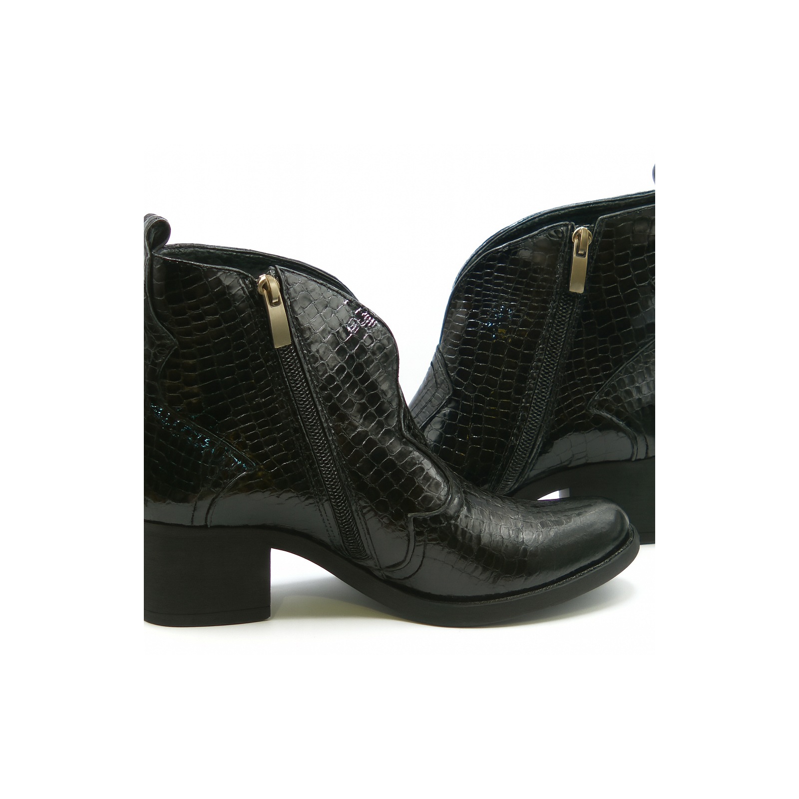 Skórzane trzewiki damskie Jaromin – czarne lakierowane botki na obcasie
