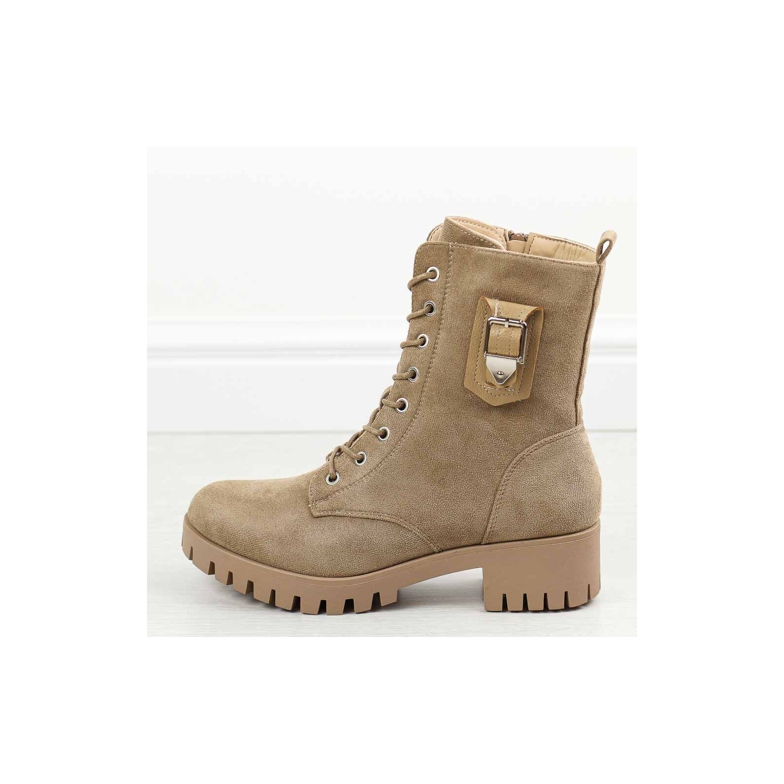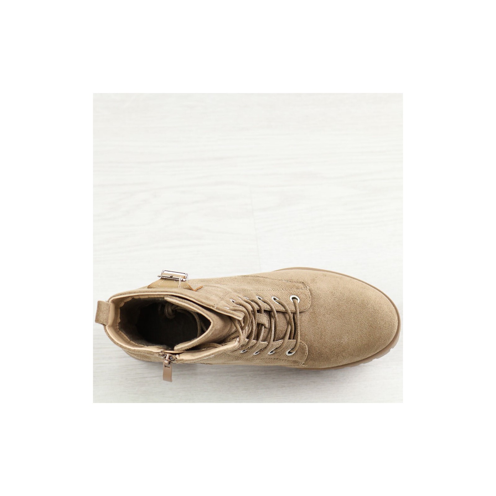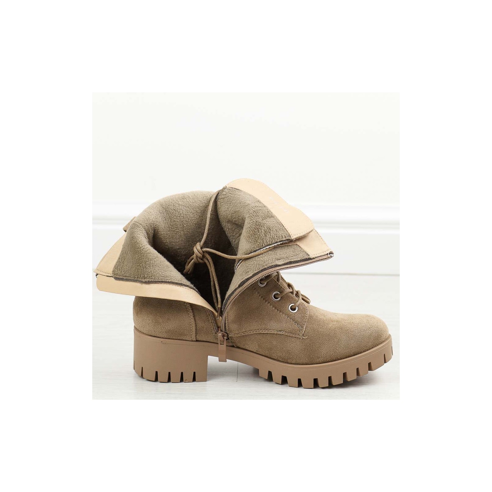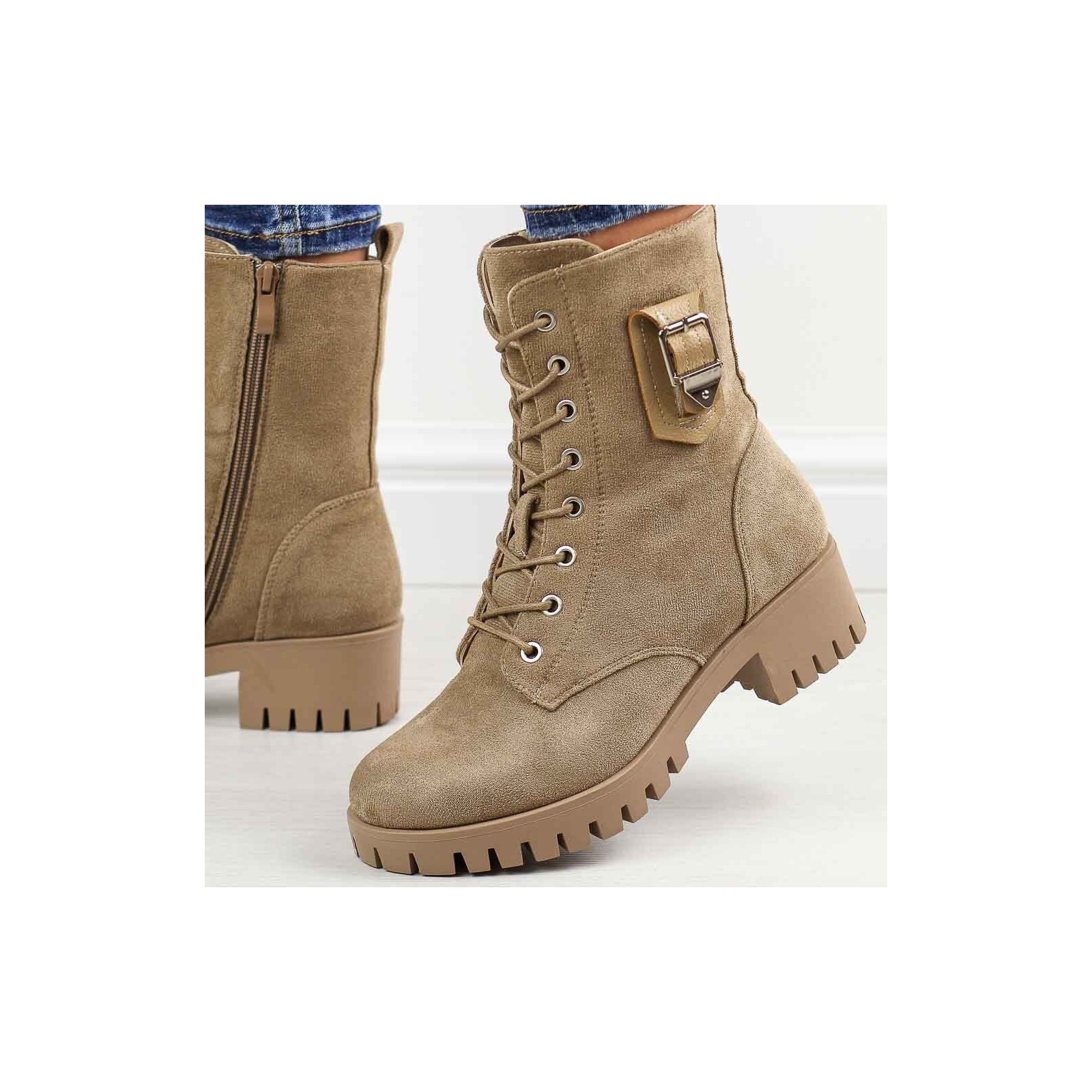 Przygotuj się na chłodne dni z naszymi beżowymi zamszowymi traperami damskimi, idealnymi na jesień oraz zimę. Te stylowe buty mają cholewkę wykonaną z trwałego materiału zamszopodobnego, co zapewnia zarówno elegancki wygląd, jak i odporność na warunki atmosferyczne. Trapery są zapinane na suwak i sznurowadła, co umożliwia idealne dopasowanie do stopy i ułatwia zakładanie oraz zdejmowanie.