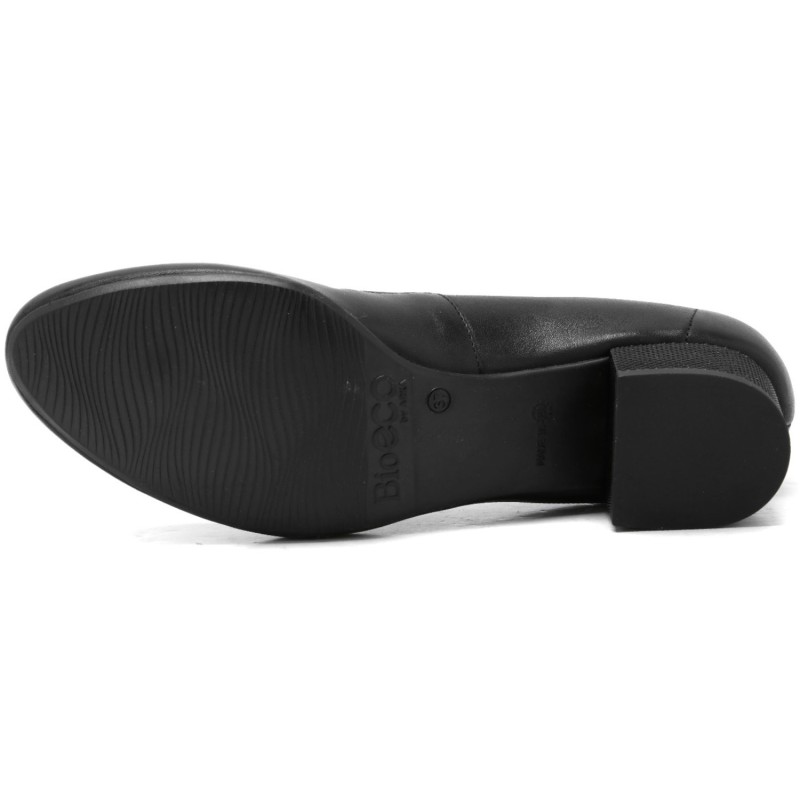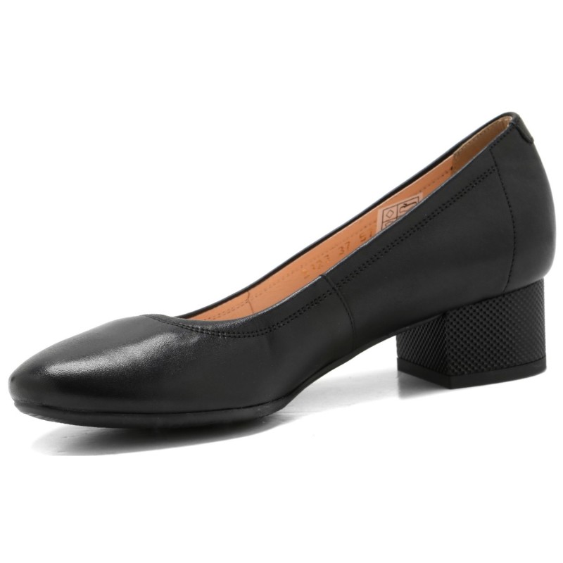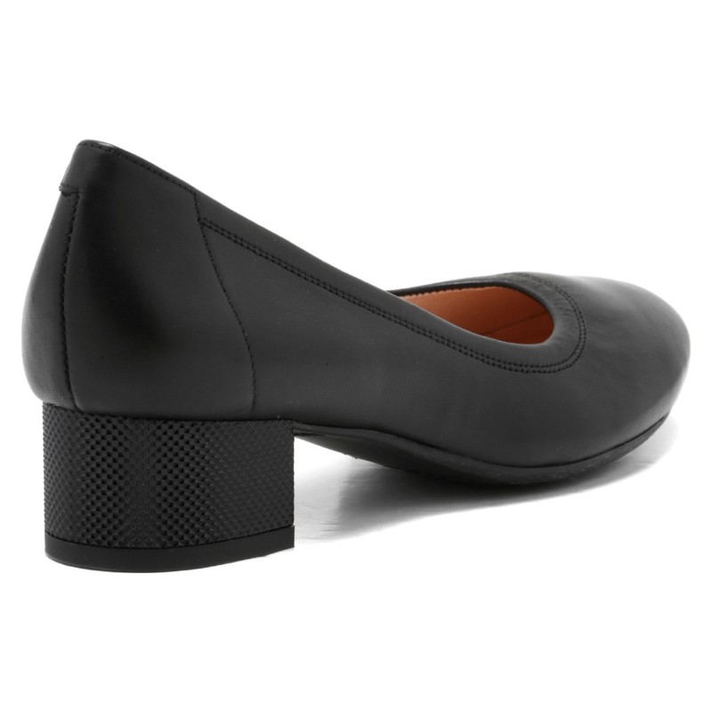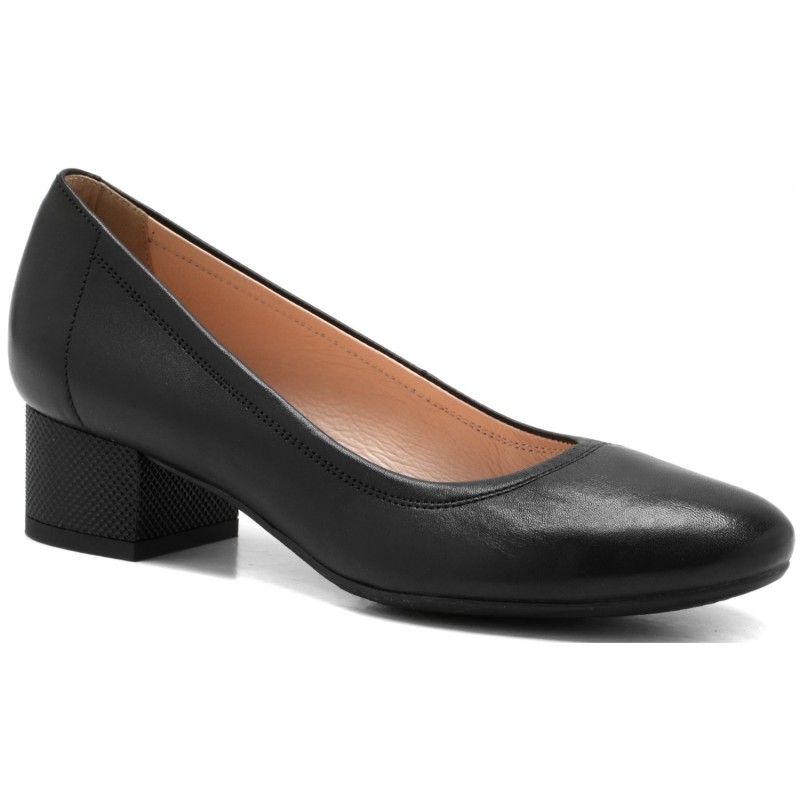 Cholewka z naturalnej skóry licowej w klasycznym czarnym kolorze wyróżnia się minimalistycznym designem i starannym wykończeniem. Stabilny klocek zapewnia komfort i pewność podczas chodzenia, jednocześnie subtelnie podkreślając sylwetkę i dodając elegancji.