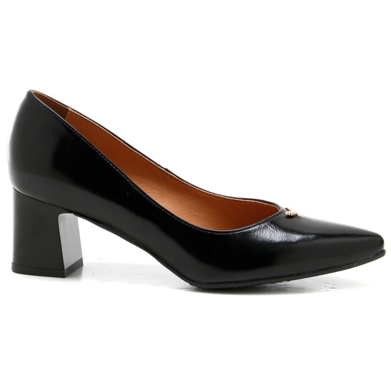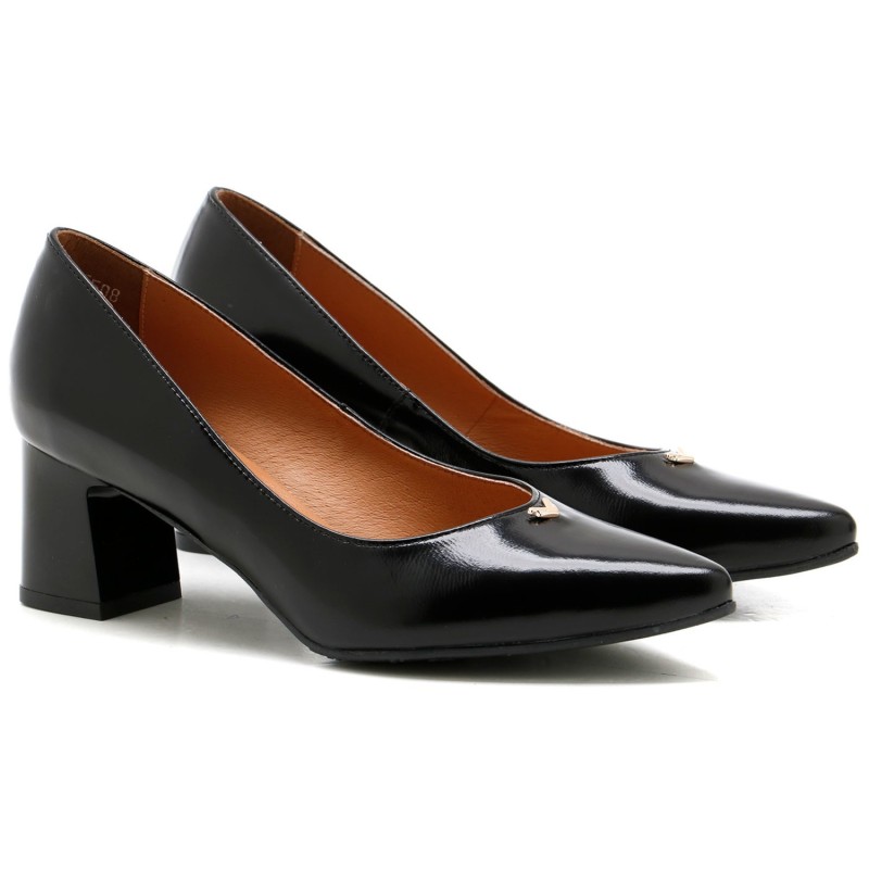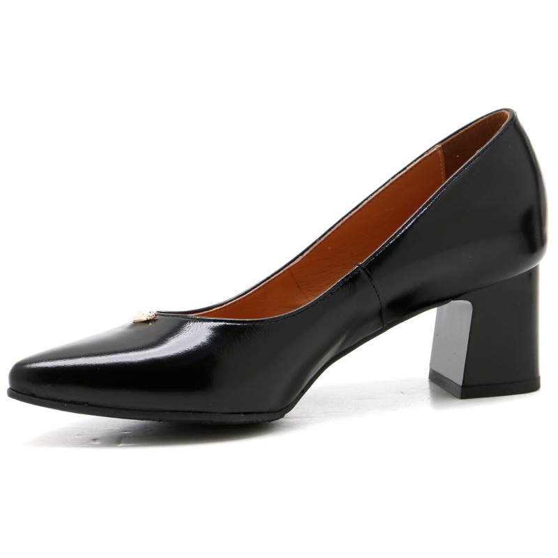 Cholewka w głębokim czarnym kolorze wykonana z wysokiej jakości skóry licowej wyróżnia się minimalistycznym stylem i precyzyjnym wykończeniem. Stabilny klocek zapewnia wygodę podczas chodzenia, jednocześnie nadając butom elegancji i klasycznego charakteru.