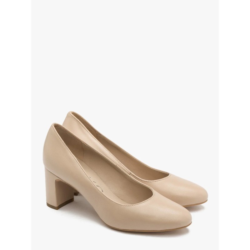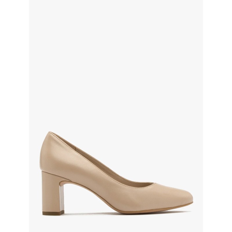Cholewka butów wykonana jest z naturalnej skóry licowej, która zapewnia trwałość i wyjątkowy wygląd. Jej gładka faktura oraz neutralny kolor sprawiają, że czółenka doskonale komponują się z różnorodnymi stylizacjami – od biurowych garniturów po zwiewne sukienki na wieczorne wyjścia. Klasyczny, lekko zaokrąglony nosek dodaje butom delikatności i podkreśla ich uniwersalny charakter.