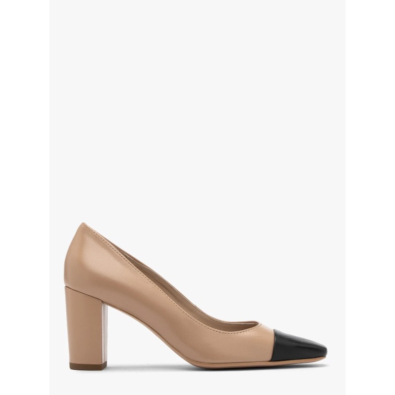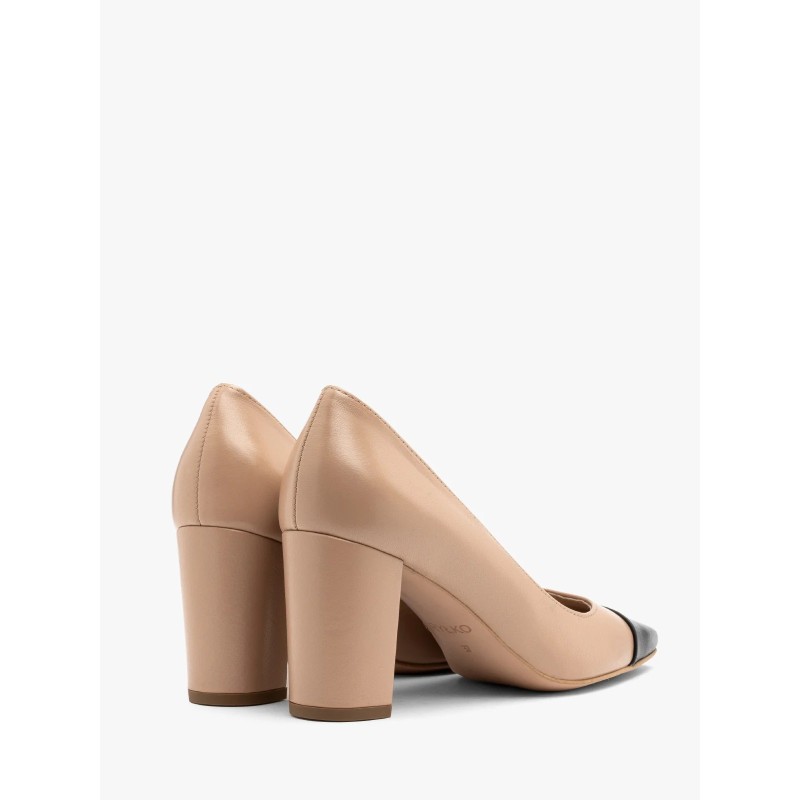Beżowe czółenka Ryłko z czarnym noskiem na słupkowym obcasie