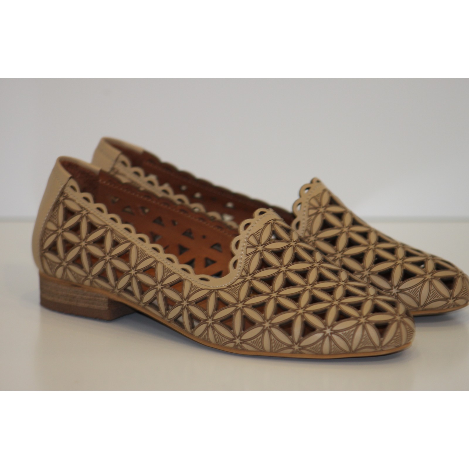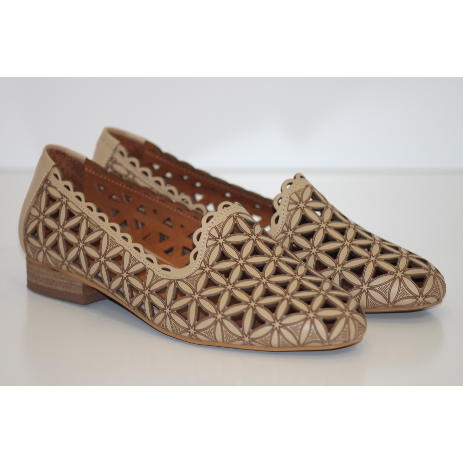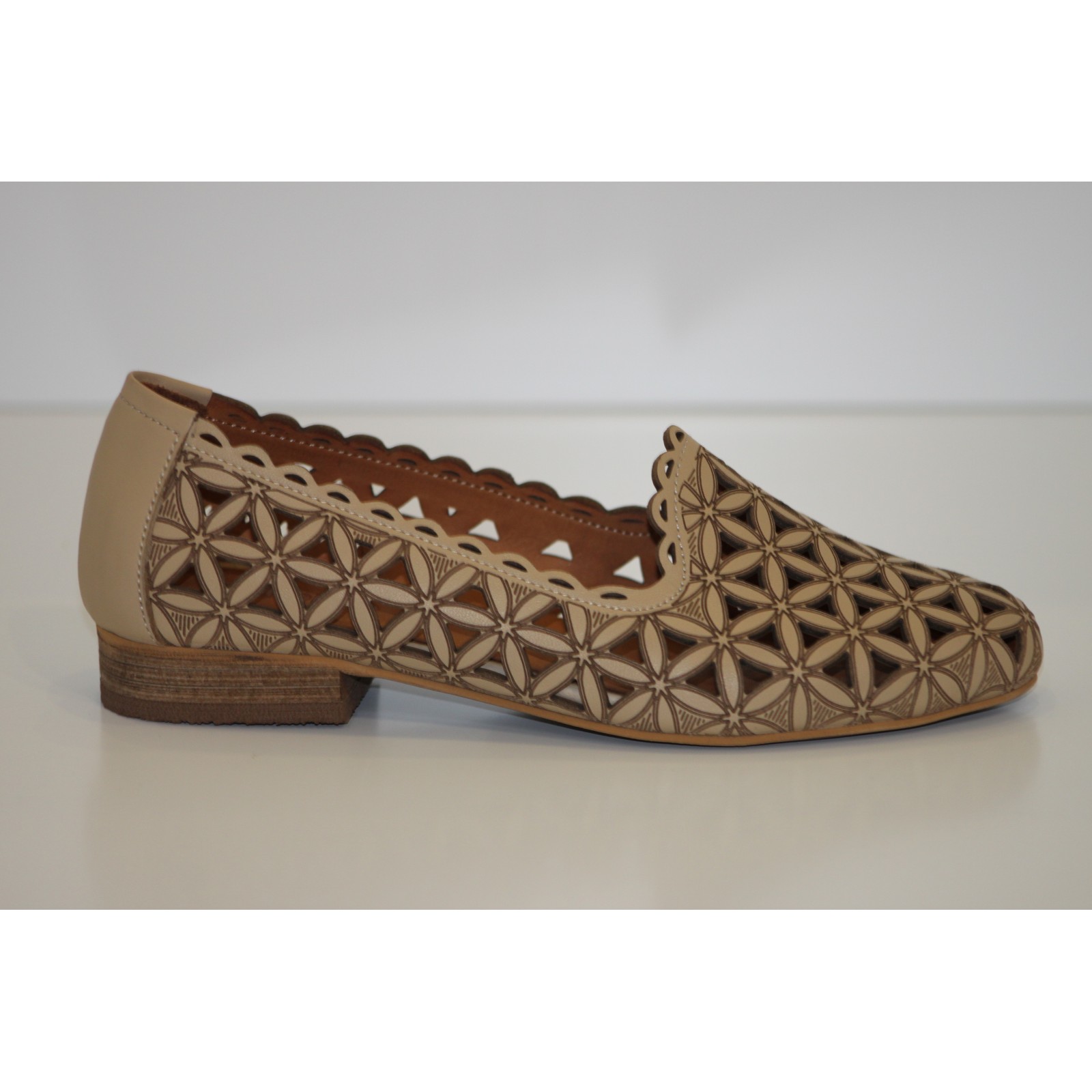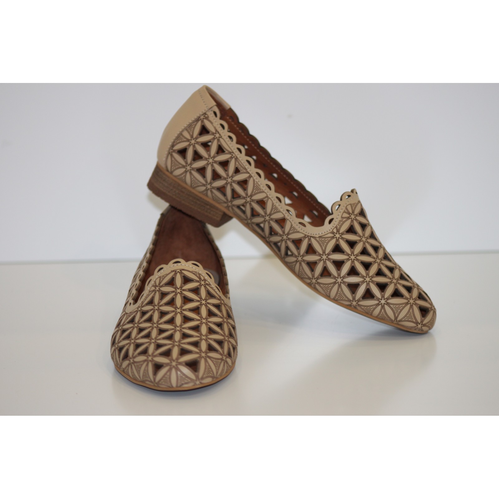Beżowe ażurowe mokasyny skórzane