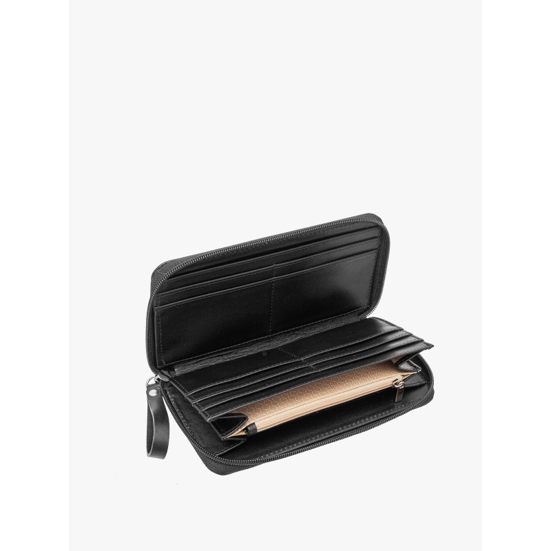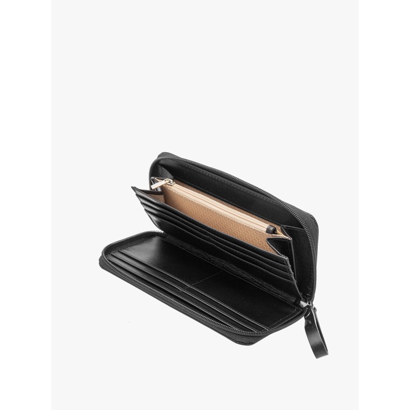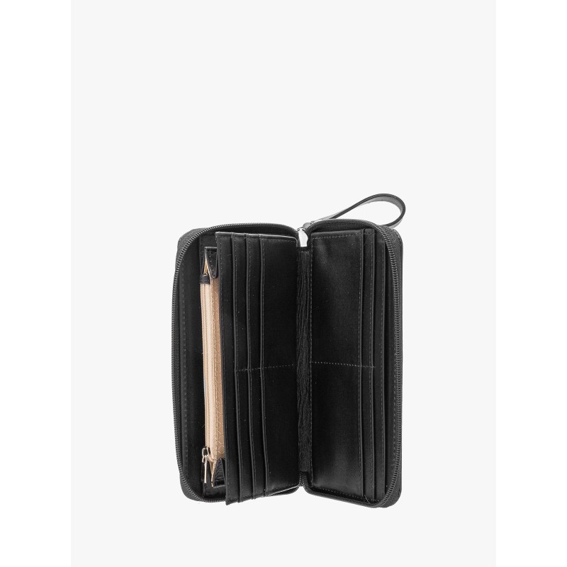 Klasyczny czarny kolor w połączeniu z subtelnymi srebrnymi elementami nadaje portfelowi wyjątkowego charakteru, który pasuje do każdej stylizacji. Starannie zaprojektowane wnętrze pozwala na wygodne przechowywanie najważniejszych rzeczy, takich jak karty, banknoty czy monety.