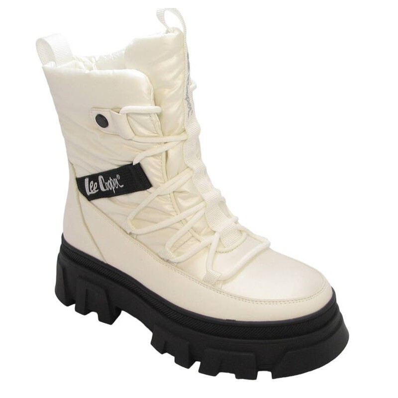Cholewka wykonana jest z wysokiej jakości materiału tekstylnego, który zapewnia trwałość i odporność na wilgoć. Klasyczna biała kolorystyka dodaje butom świeżości i sprawia, że wyróżniają się w zimowych stylizacjach. Wysoka konstrukcja oraz dodatkowe wzmocnienia chronią stopy i łydki przed śniegiem i chłodem, zapewniając jednocześnie swobodę ruchu.