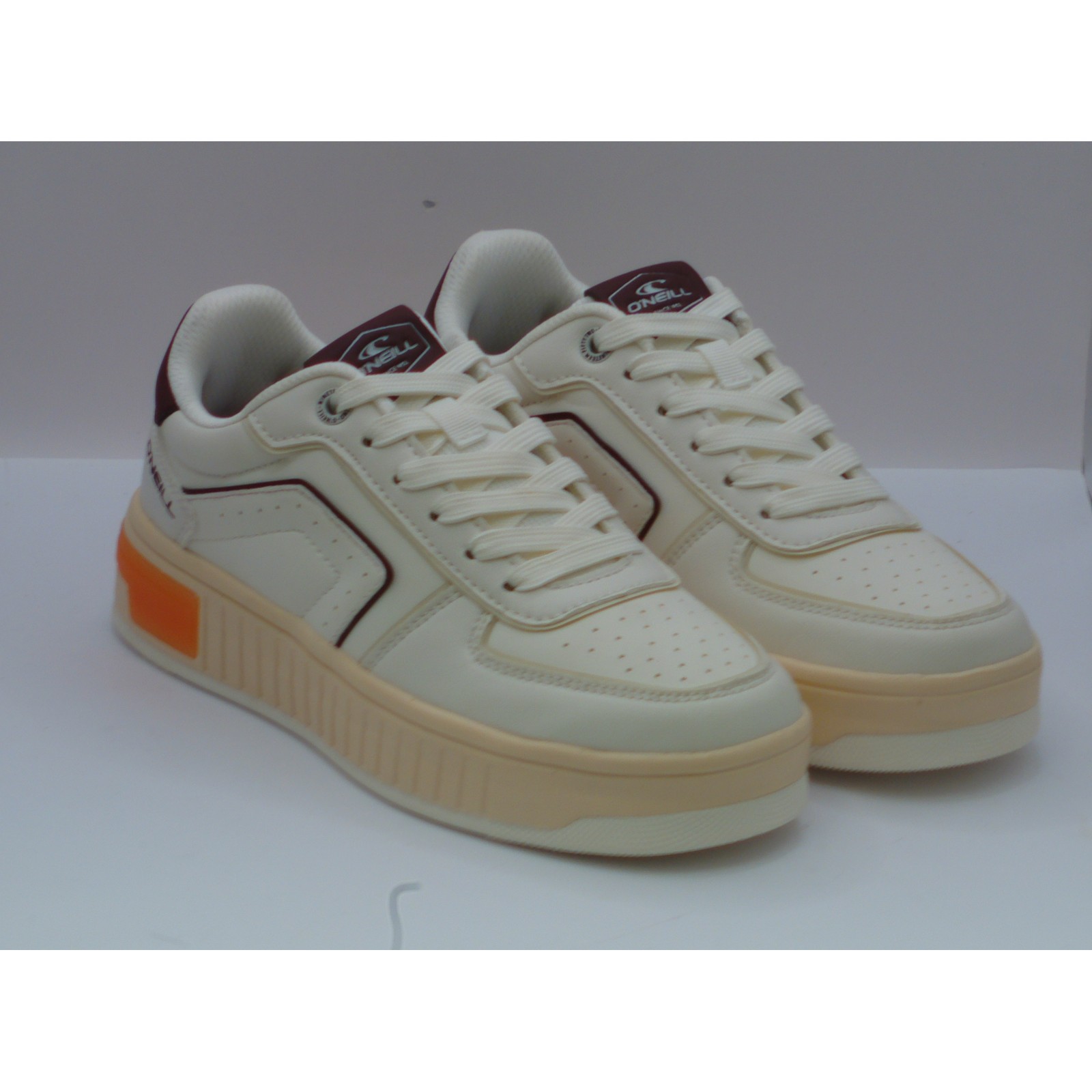 Modne i wygodne sneakersy damskie O’Neill Jolla Women w kremowej kolorystyce z bordowymi i pomarańczowymi detalami. Idealne do miejskich i casualowych stylizacji.