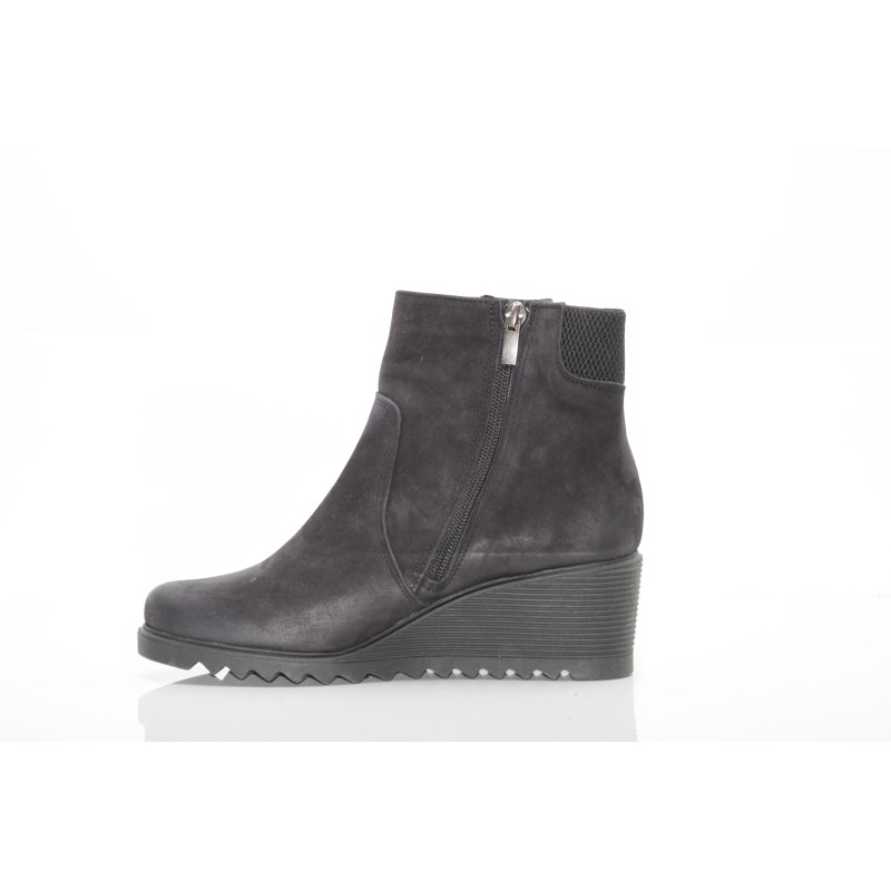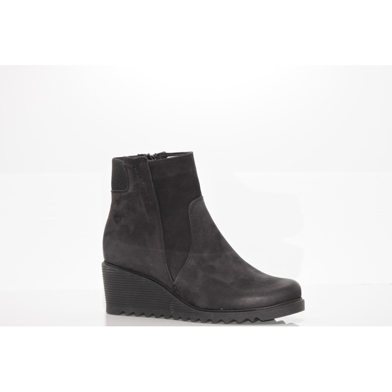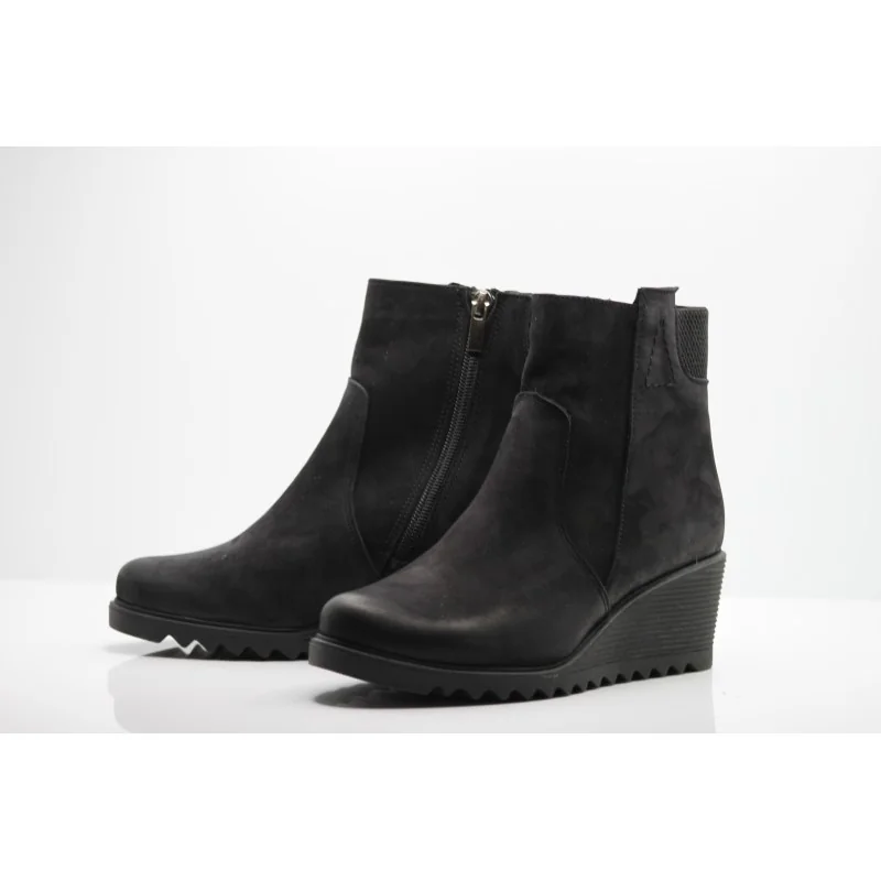 Cholewka w klasycznym czarnym kolorze z nubuku nadaje butom subtelnego, matowego wyglądu, który świetnie komponuje się z różnymi stylizacjami. Zapięcie na suwak zapewnia wygodę zakładania i zdejmowania, a koturn o wysokości 6 cm podkreśla sylwetkę, jednocześnie zapewniając stabilność i wygodę podczas noszenia.